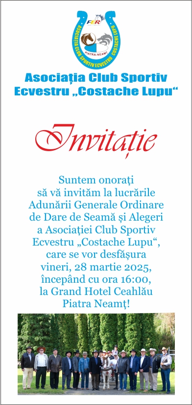 Sunteți convocat(ă) la lucrările Adunării Generale Ordinare de Dare de Seamă și Alegeri a ACSE „Costache Lupu“, care se va desfășura pe data de 28.03.2025, începând cu ora 16:00, în Salonul Boema al Grand Hotel Ceahlău Piatra Neamț, cu următoarea Ordine de zi: